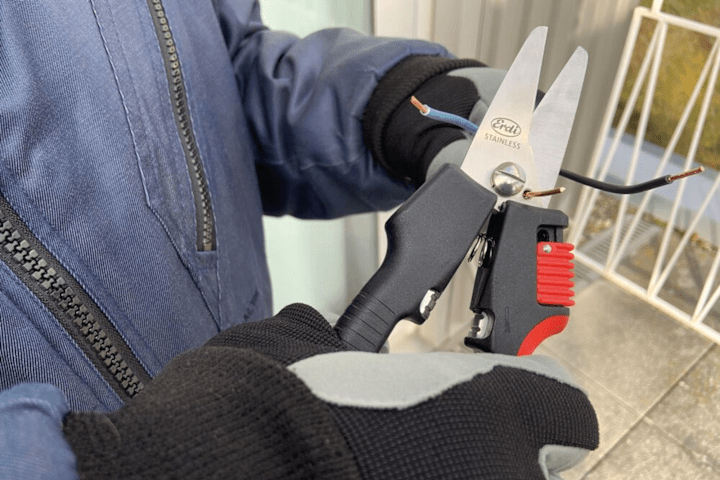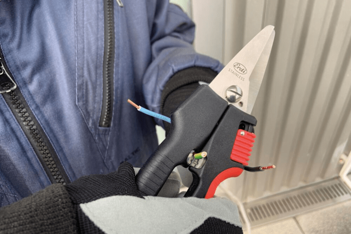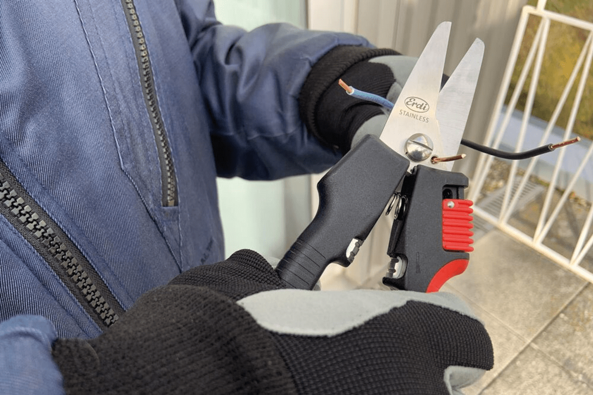 Klingen aus rostfreiem Edelstahl Ergonomischer Kunststoffgriff mit Weichstoffeinlage Mit Drahtführung zum Schneiden von Bindedraht bis Ø 2,5 mm Rundschneiden am Anschlag zum Abisolieren von Kabeln von Ø 1,0 bis 1,5 mm SB-verpackt