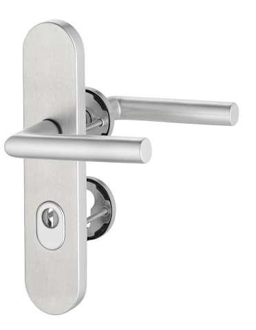 Schutz-Kombi-Drückergarnitur Metis 8742/7203, Langschild/Rosette, 15mm, ES 1, mit Zylinderabdeckung, Profilzylinder gelocht, Entfernung 72mm, Vierkant 8mm, TS 35 - 45mm, grau, edelstahl, matt