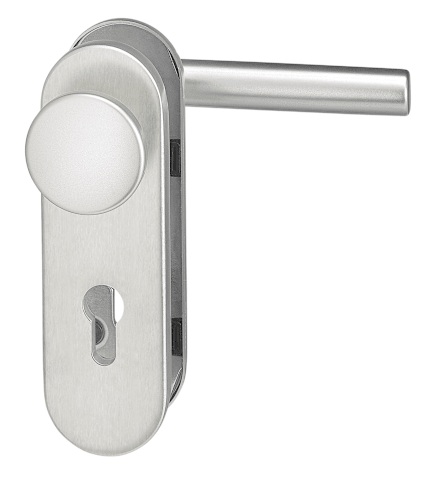 Vollblatt Sicherheits-Wechselgarnitur Logo 8793/0772,Kurzschild,ohne Zylinderabdeckung 72/8,DIN Links-Rechts,edelstahl matt,Türstärke35-45,rund/Gehrung fest