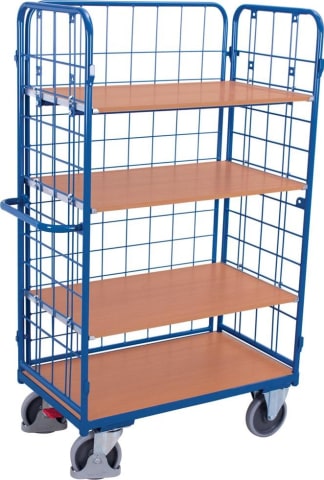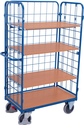 Etagenwagen mit 3 Stahlrohrwänden, 4 Böden • Stahlrohr-/Profilstahl-Konstruktion: geschweißt, pulverbeschichtet • Schraubverbindung: europäisches Patent Nr. 03 015 642.6 und deutsches Patent Nr. 103