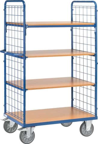 Etagenwagen, Stirnseitig mit Drahtgitter • Stahlrohr-/Profilstahl-Konstruktion: geschweißt, pulverbeschichtet in RAL 5007 brillantblau • Schraubkonstruktion (Baukastensystem) • Stirnwände: mit Drahtgitterwänden 100 x 100 x 5 mm • Böden: 1x fest, 3x variabel, zum Einlegen im Raster 100 mm • Bodenmaterial: Sandwich-Platten, tragfähig, biegesteif, Oberflächen Buchendekor • Traglast: 90 kg pro Boden • Rollen: 2 Bockrollen, 2 Lenkrollen mit Feststeller, gemäß der Europäischen Norm EN 1757-3 (Sicherheit von Plattformwagen) • Räder: TPE-Bereifung, leichtlaufend • Naben: Rillenkugellager