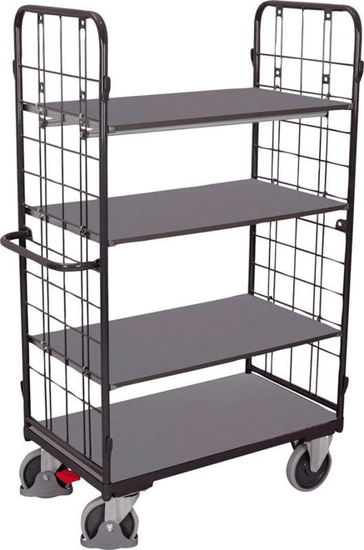 Etagenwagen mit 2 Stahlrohrwänden, 4 Böden • Stahlrohr-/Profilstahl-Konstruktion: geschweißt, pulverbeschichtet • Schraubverbindung: europäisches Patent Nr. 03 015 642.6 und deutsches Patent Nr. 103 53 633 • Längswände: einhängbar • Böden: Holzwerkstoffplatte, Tragkraft 80 kg • Einlegeboden: variabel im Raster 120 mm einsetzbar • Rollen: 2 Lenk- und 2 Bockrollen, gemäß Norm Lenkrollen mit Radfeststeller und Fußschutz • Reifen: thermoplastische Gummibereifung in graublau, non-marking • Naben: Präzisions-Rillenkugellager • EasySTOP-Bremssystem: serienmäßig