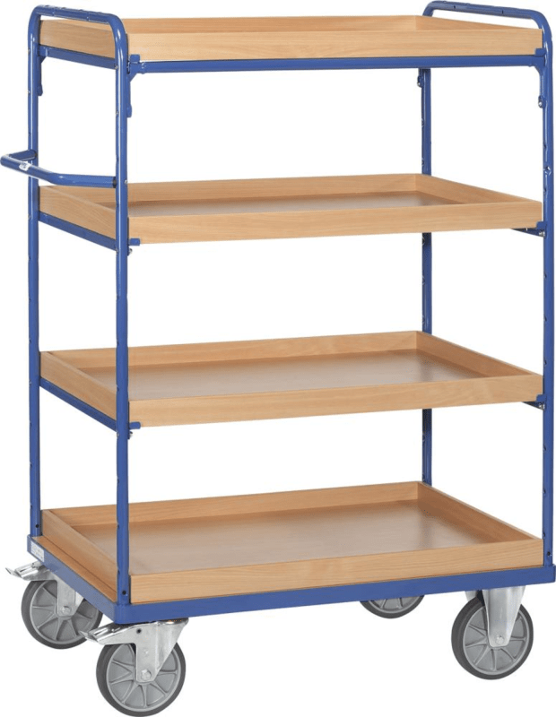 Etagenwagen, mit Kästen • Stahlrohr-/Profilstahl-Konstruktion: geschweißt, pulverbeschichtet in RAL 5007 brillantblau • Schraubkonstruktion (Baukastensystem) • Einlegekästen: 1x fest, Rest variabel im 100 mm Raster einsetzbar • Bodenmaterial: Sandwich-Platten, tragfähig, biegesteif, Oberflächen Buchendekor • Traglast: 120 kg pro Einlegekasten • Rollen: 2 Bockrollen, 2 Lenkrollen mit Feststeller, gemäß der Europäischen Norm EN 1757-3 (Sicherheit von Plattformwagen) • Räder: TPE-Bereifung, leichtlaufend • Naben: Rillenkugellager