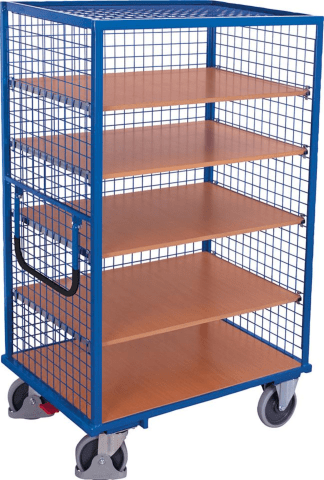 Etagenwagen mit Drahtgitter-Wänden • Winkelstahl-Konstruktion: pulverbeschichtet in RAL 5010 enzianblau • Wände/Dach: Drahtgitter 50 x 50 x 4 mm, verschweißt • Schiebe-/Ziehbügel: abklappbar, inkl. weichem schwarzen Kunststoffüberzug • Böden: Holzwerkstoffplatte, Oberfläche Buchendekor, Tragkraft 80 kg • Bodenträger: im 100 bzw. 50-mm-Raster variabel einsetzbar • Räder: 2 Lenkrollen, 2 Bockrollen, gemäß Norm Lenkrollen mit Radfeststeller und Fußschutz • Reifen: thermoplastische Gummibereifung in graublau, non-marking • Naben: Präzisions-Rillenkugellager • EasySTOP-Bremssystem: serienmäßig