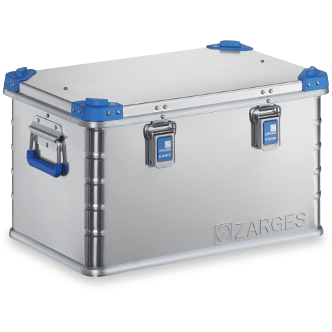 ZARGES Eurobox: Die stabile und leichte Transport- und Lagerlösung mit den markant blauen Ecken und umfangreichem Zubehörprogramm. -Staub- und Spritzwasserschutz durch umlaufend eingeschäumte Deckeldichtung. -Ausgestattet mit zwei stabilen Deckelhaltegurten. -ZARGES Comfort-Verschluss für ergonomische Bedienbarkeit und extrem lange Lebensdauer. -ZARGES Comfort-Handgriffe für ergonomische Handhabung und Belastungen bis 50 kg. -Solide Verarbeitung für lange Lebensdauer sowie höchste Stapel- und Traglasten bei geringem Eigengewicht. -Abgestimmt auf Palettenmaße nach DIN 15 141. -Stabile Universalkiste aus Aluminium. -Profilstöße vollverschweißt. -Hohe Korrosionsbeständigkeit durch Beschlagteile aus Edelstahl. -Ecksicken für zusätzliche Formstabilität. -Hohe Stabilität durch Deckel-, Rand- und Bodenprofilrahmen aus vollverschweißten Aluprofilen. -Zusätzliche Sicherung der Verschlüsse mit Aufspringsicherungsfeder auch nachträglich möglich. -Klappverschlüsse: Sicherung durch Steckschloss, Plomben, Aufspringsicherungsfeder oder Vorhängeschloss (max. Bügelstärke 6 mm) möglich. -Sichere Stapelbarkeit durch Stapelecken aus schlagfestem blauem Kunststoff.
