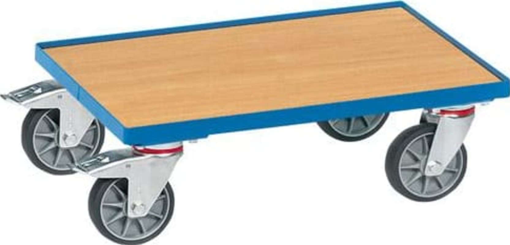 Eurokasten-Roller mit Boden und 15 mm Rand • Winkelstahl-Konstruktion: pulverbeschichtet in RAL 5007 brillantblau • Boden: aus Holzwerkstoffplatte • Rollen: 4 Lenkrollen, 2 mit Rad-Feststeller, gemäß der Europäischen Norm EN 1757-3 (Sicherheit von Plattform-Wagen) • Bereifung: TPE, leichtlaufend • Naben: Rillenkugellager Hinweis: Für den Einsatz von Eurokästen mit dem Maß 600 x 400 mm.
