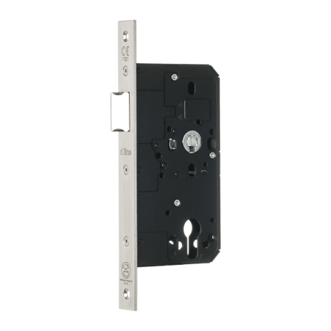 Knud Holscher Kollektion, Fallenschloss, 60 mm, Vierkantstulp. Gefertigt aus hochwertigem, rostfreiem Edelstahl AISI 316, der vor starker Korrosion schützt. Zertifiziert nach EN 12209Feuergeprüft nach EN 1634. 20 Jahre Garantie.