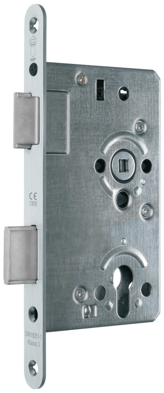 SSF, Behörden-Fallen-Einsteckschloss, Lochung: Profilzylinder gelocht, Dornmaß: 55 mm, Drückernussvierkant: 8 mm, Einzelteilmaterial Stulp: Edelstahl, Stulpform: Flachstulp, Stulpeigenschaft: beidseitig überstehend, Stulpbreite: 18 mm, Stulplänge: 170 mm, Stulpstärke: 3 mm, Stulpausführung: rund, Modellnummer: 53 FSK, DIN-Richtung: DIN Rechts, Farbton Stulp: edelstahl, Oberfläche Stulp: fein matt, Wechsel: ohne Wechsel, Türausprägung: Türe gefälzt, Schlossklasse: Klasse 3, Ergänzung: mit Späneschutzhülsen, mit Nachschmiereinrichtung, ohne Schlosstaschenabstützung, Funktion: Normalfunktion, Türart: Innentüren, Türflügelanzahl: einflügelig, Einzelteilmaterial Falle: Stahlfeinguss, Oberfläche Falle: vernickelt, Falleneigenschaft: mit Standardfalle, Drückernuss: Klemmnuss, Einzelteilmaterial Drückernuss: Stahl, Schlosskasten: geschlossen, Einzelteilmaterial Schlosskasten: Stahl, Oberfläche Schlosskasten: verzinkt, Schlosskastenbreite: 85 mm, Schlosskastenlänge: 100 mm, Schlosskastenstärke: 15,5 mm,Ausführung : kurz, Norm: DIN 18251-1, Türwerkstoff: Holz, Aluminium, Kunststoff, Zulassung: entsprechende Standard Zulassung