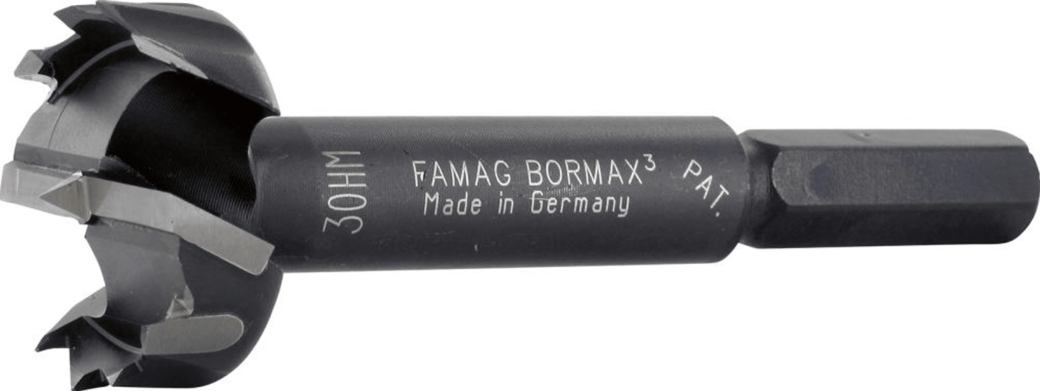 Bormax® mit HW-SchneidenHW-bestückter Forstnerbohrer mit Zentrierspitze, HW-Hauptschneide und HW-bestückte, gezahnte Umfangschneide in Wellenschliff. Geeignet für Weichholz, europäisches und exotisc