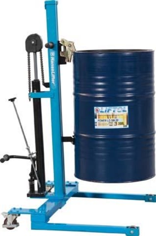 Fassheber Modell FHR300 • Greifmechanismus: selbstschließend • Hub: kraftschonend mit Fußpumpe • Absenkung: stufenlos mit Drehknauf • Bremse: Feststellbremse • Rollen: Polyurethan • Lackierung: RAL 5012 lichtblau • Auslegerabstand: breit, zum Umfahren von Europaletten und zur direkten Aufnahme von Fässern Hinweis: Für Stahlsickenfässer, DIN 208 l.