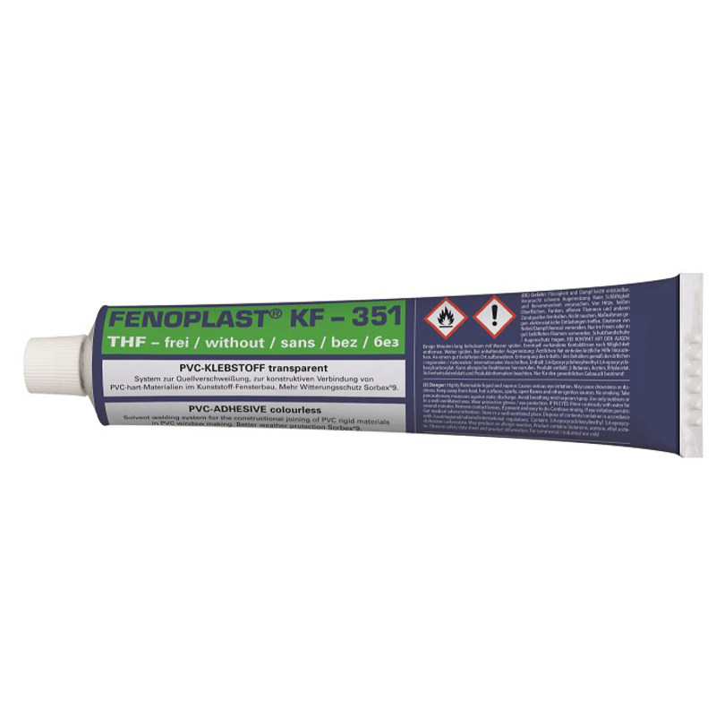 Der Klebstoff KF-351 erzeugt konstruktive Verbindungen durch Quellverschweißung von PVC-Hart-Teilen aller Art, insbesondere Profilmaterial, wie Ablaufleisten und Schlagleisten, sowie von Rohren und Fittings.