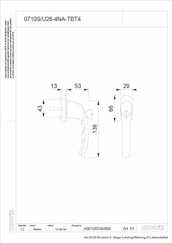 HOPPE Fenstergriff Tokyo 0710S/U26, abschließbar, oval,Vierkant 7/32, TBT4, gleichschließend, 2W 153, verkehrsweiß beschichtet