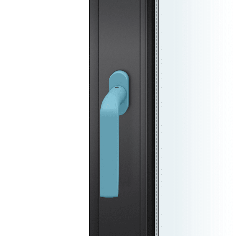 FSB Fenstergriff 34 1267; Produkttyp: Fenstergriff; Produkttyp (Hersteller): Fenstergriff; Ausführung: Standard; Rastung: 90°; Stütznocken: mit Stütznocken; Material: Aluminium; Montageart: aufliegend; Befestigungsart: verdeckt verschraubt; Anwendung: für nach innen öffnende Fenster und Fenstertüren; Design: Hartmut Weise; Länge: 135 mm; Höhe: 53 mm; Befestigungsabstand: 43 mm; Form Rosette: schmal oval; Breite Rosette: 27 mm; Höhe Rosette: 62 mm; Stärke Rosette: 10 mm; Durchmesser Stütznocken: 10 mm; Norm: DIN EN 13126-3,DIN 18267; Gütesiegel: RAL-GZ 607/9; Einsatzbereich: Drehkipp; Fensterwerkstoff: Aluminium,Holz,Kunststoff; Vierkant: 7 mm; Stift vorstehend: 24-38 mm; DIN-Richtung: DIN Links-Rechts; Farbton: LC 32031 céruléen vif; Oberfläche: pulverbeschichtet