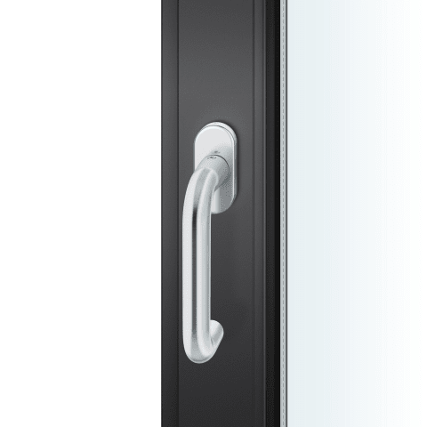 Fenstergriff ovale Rosette, 7mm Stift. 10mm Nocken, Stiftüberstand 24-38mm, Edelstahl fein matt