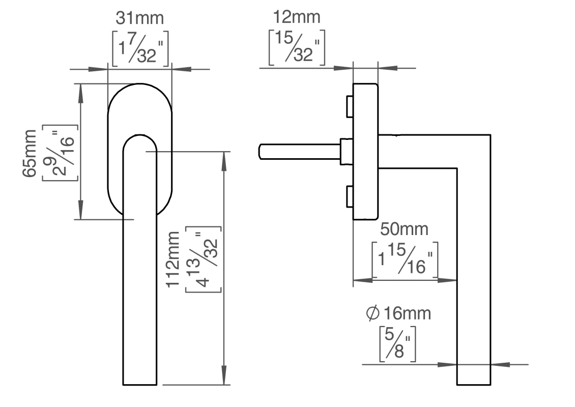 Knud Holscher Kollektion, Fenstergriff 16FFG, 90°/180°, hohe Rosette, 65x30mm, 7x7mm, L=45mm. Hergestellt aus hochwertigem, rostfreiem Edelstahl AISI 316, der vor starker Korrosion schützt. 20 Jahre Garantie.
