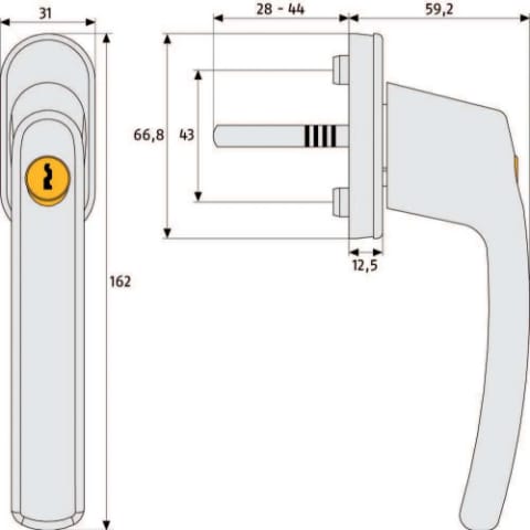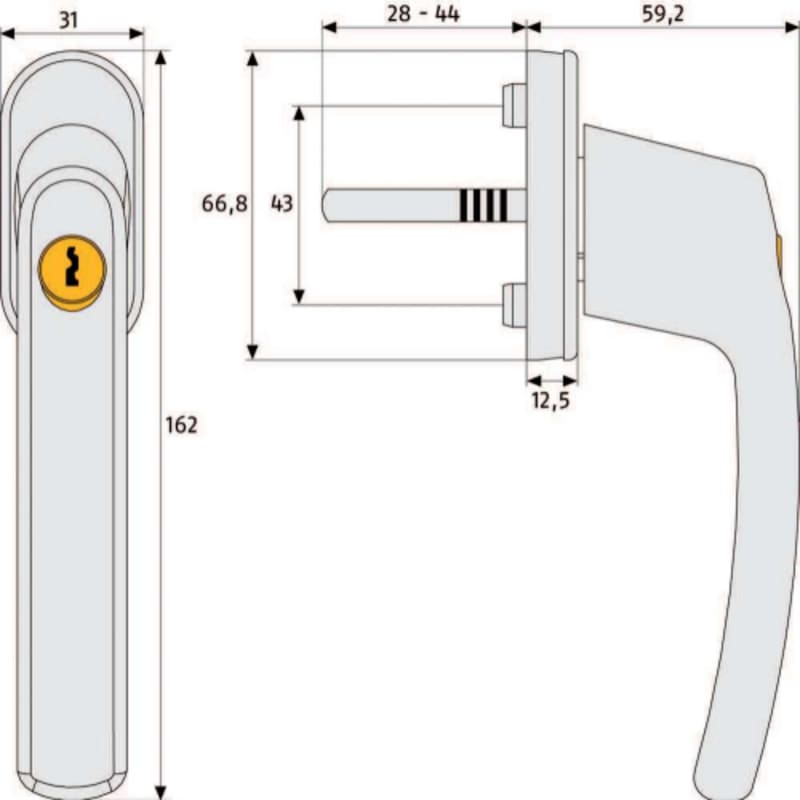 Abschließbarer Fenstergriff mit Druckzylinder und längenverstellbarem Vierkantstift. Einsatz und Anwendung: • Für nach innen und nach außen öffnende Fenster • Auch als Kindersicherung geeignet • Vers