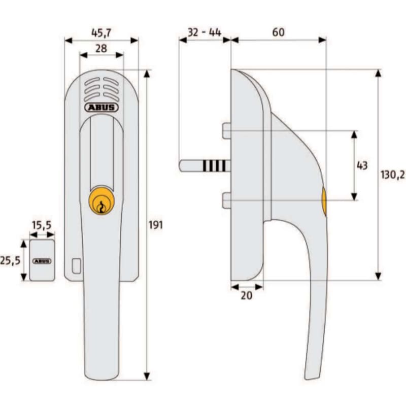 Abschließbarer Fenstergriff mit Alarm, Druckzylinder und längenverstellbarem Vierkantstift. Einsatz und Anwendung: • Nachrüstartikel für den Bereich Dreh-Kipp-Fenster, Fenstertüren als Stand-Alone-Lösung • Elektronische Überwachung von Fenstern und Fenstertüren • Druckzylinderabfrage zur Scharf/Unscharfschaltung - Fenster können ohne Gefahr eines Fehlalarms geöffnet oder geschlossen werden • Keine Auslösung des Alarms durch starken Wind oder aufprallende Bälle etc. • Auch als Kindersicherung geeignet Technologie: • Scharf- und Unscharfschaltung durch Betätigen des Druckzylinders • Individuell einstellbarer, gesicherter Vierkantstift, 32-44 mm Länge • Gleichschließend kombinierbar mit weiteren ABUS-Fenstersicherungen • 110 dBA laut (+/- 2 dBA) • Handelsübliche Alkaline-Batterien (AAA), austauschbar, Batterielaufzeit bis zu 2 Jahre • Optional Glasbruchmelder verfügbar (GBM7300 W & B) • Nach DIN18267 Klasse 2 • 200Nm Abdreh- und Abreißfestigkeit