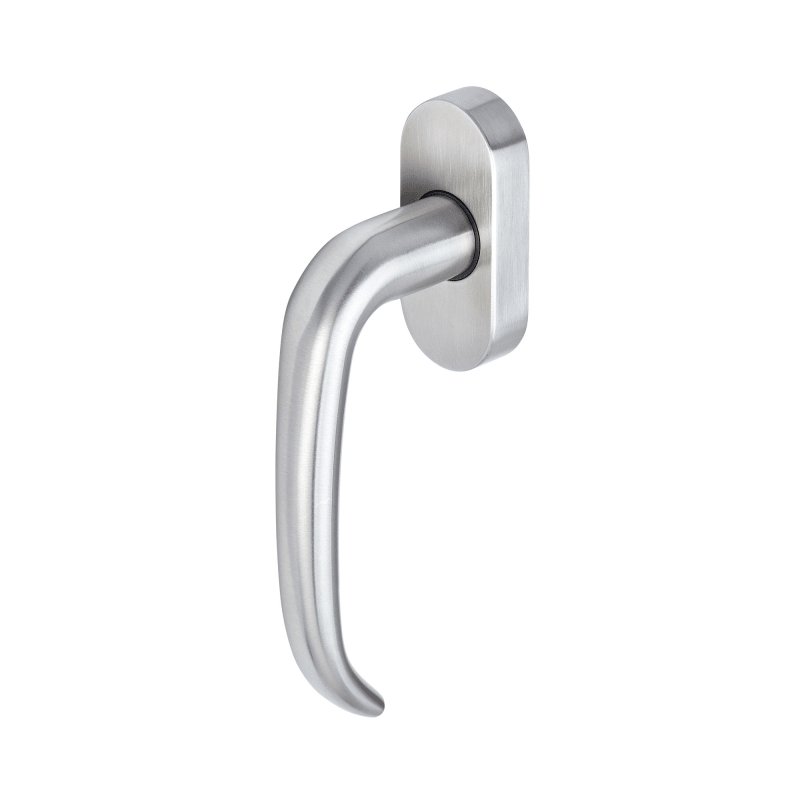 BKS Fenstergriff TREMOLO B-78820; Material: Edelstahl; Vierkant: 7 mm; Befestigungsart: verdeckt verschraubt; Befestigungstechnik: mit Stütznocken; Lieferung: mit Vierkantstift; Basis: Fenstergriff; Oberfläche: matt gebürstet; Farbton: edelstahl; Stift vorstehend: 29 mm; Rastung: 90°; DIN-Richtung: DIN Links-Rechts; Einsatzbereich: Drehkipp; Anwendung: für nach innen öffnende Fenster und Fenstertüren; Griffform: gebogen; Grifflänge: 145 mm; Griffhöhe: 70 mm; Sockelausführung: mit ovaler Rosette; Sockelbreite: 32 mm; Sockelhöhe: 70 mm; Sockelstärke: 12 mm; Befestigungsabstand: 43 mm; Nockendurchmesser: 10 mm; Fensterwerkstoff: Kunststoff,Holz; Bunddurchmesser: 21 mm