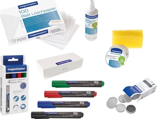 Zubehör-Set für Whiteboards • Zur Beschriftung und Reinigung von weißen Tafeln Inhalt: 4 Board- und Flipchartsmarker PRO+ (rot, blau, grün und schwarz) 1 Löscher magnethaftend 1 Packung Löschpapier