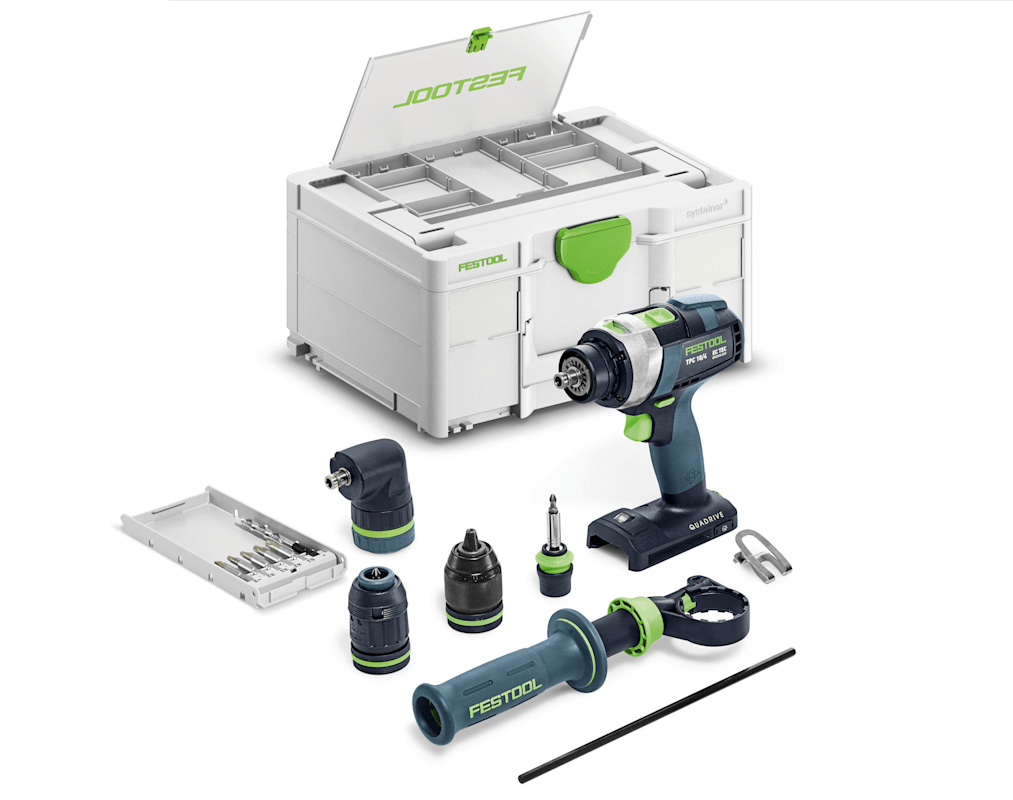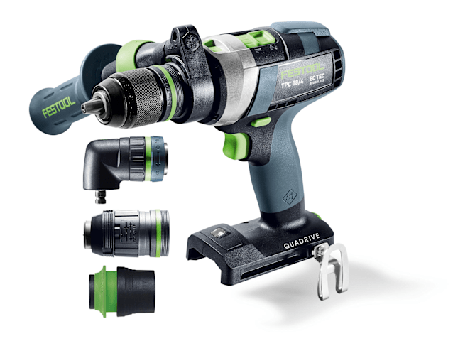 Kraftvoll für Schraub- und Bohrarbeiten mit großen Durchmessern, schnell für sauberen Arbeitsfortschritt bei kleineren Durchmessern|Maximale Leistung: dank äußerst kraftvollem, bürstenlosem und somit langlebigem EC-TEC Motor|Robust: unverwüstliches 4-Gang-Metallgetriebe, zusätzlich mit den umfassenden Serviceleistungen des Festool Service rundum abgesichert|Für noch mehr Anwendungsvielfalt: zuschaltbarer Axialschlag zum Bohren in Mauerwerk|Der QUADRIVE mit 4 Gängen für jede Arbeitssituation: vom Schrauben mit 50 Nm Drehmoment im 1. Gang bis zum präzisen Bohren mit 3.600 U/min im 4. Gang|Vielseitig: dank FastFix Schnittstelle schnelles und werkzeugloses Umrüsten auf Bohren, Schrauben, Winkelbohren und Winkelschrauben|Der Tiefenanschlag und der Exzentervorsatz ermöglichen zusätzlich tiefenbegrenztes und randnahes Schrauben|Flexibles Akkusystem: Sowohl für energieintensive Anwendungen als auch für leichte Bohr- und Schraubanwendungen findest du den passenden Akkupack|Rundum abgesichert: Selbstverständlich gelten die umfassenden Serviceleistungen des Festool Service auch für den Akkupack|Komfortabel: optimale Ausleuchtung des Arbeitsbereichs durch zuschaltbare LED-Beleuchtung – auch über die Festool App steuerbar|Die hochwertige Bitkassette BKS SYS3 D6 PZ TX 50 CE ist bereits im Lieferumfang enthalten: Bit PZ 2 50 mm CE, Bit TX 20 50 mm CE, Bit TX 25 50 mm CE, Bit TX 30 50 mm CE, Bit TX 40 50 mm CE, Metallbohrer D6 HSS CE|Mobil: Der QUADRIVE kommt im Deckelfach-Systainer – und kann für den einfachen Transport von der Werkstatt bis zur Baustelle perfekt in die bott Fahrzeugeinrichtung integriert werden Das robuste 4-Gang-Metallgetriebe überzeugt im QUADRIVE mit enormer Kraft und hohen Drehzahlen und hält auch größten Belastungen stand. Das rundum optimierte Schaltkonzept erlaubt schnelles und kontrolliertes Schalten von jedem Gang direkt in jeden anderen. Die neueste Generation bürstenloser EC-TEC Motoren sorgt für schnellen Arbeitsfortschritt und saubere Bohrergebnisse.|Zahlreiche Vorsätze, kombiniert mit perfekt abgestimmtem Zubehör, machen den TPC zum vielseitigsten Schlagbohrschrauber – unübertroffen in seiner Klasse. Die smarte FastFix Schnittstelle erlaubt einen schnellen, werkzeuglosen Wechsel der Vorsätze – für flexibles Bohren, Schrauben, Winkelbohren und Winkelschrauben. Der Tiefenanschlag und der Exzentervorsatz ermöglichen zusätzlich tiefenbegrenztes und randnahes Schrauben.|Auch wenn er vor Kraft strotzt, liegt der TPC dank seiner ausgezeichneten Griffergonomie und der kurzen Bauform perfekt in der Hand. Und damit es nicht gefährlich wird: Der elektronische KickbackStop minimiert das Risiko, sich bei einem plötzlichen Verhaken des Bohrschraubers das Handgelenk zu verdrehen.