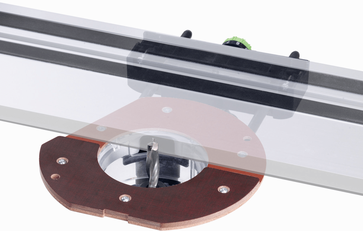 Exakt geführt. Mit dem Führungsschienen-Adapter kann die Oberfräse sicher und exakt gerade auf der Führungsschiene geführt werden. Die Kombination mit der Führungsschiene eignet sich vor allem zum Ein