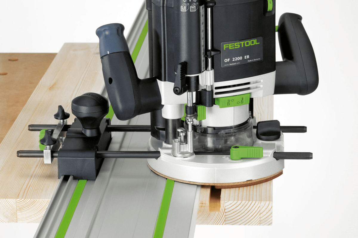 Durch die Abstützung wird ein Abkippen der Oberfräse von der Führungsschiene verhindert