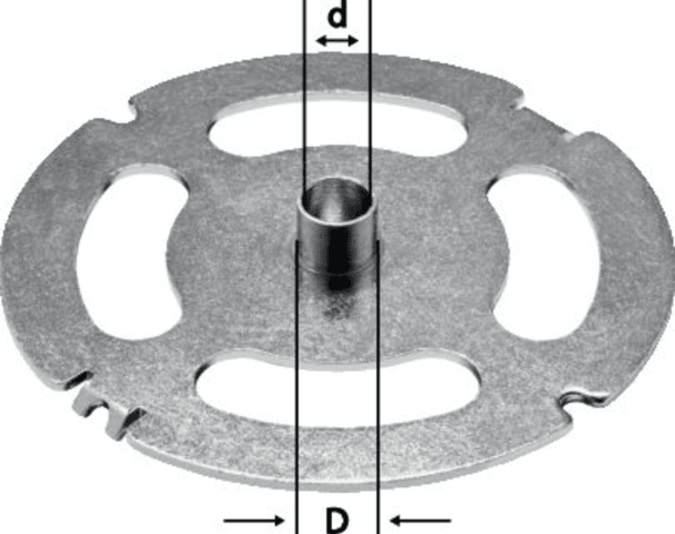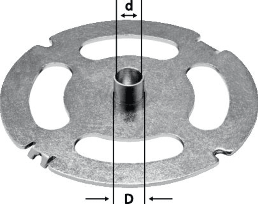 Kopierring zur sicheren Führung der Oberfräse beim Fräsen mit einer Schablone. Hierbei spielt es keine Rolle, welche Form die Schablone hat.