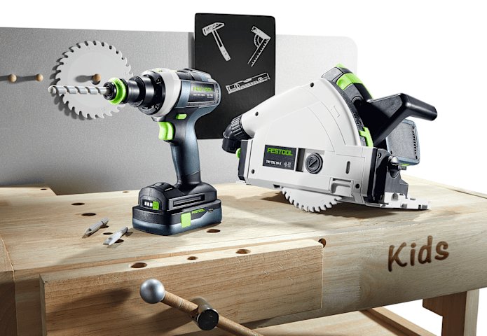 Festool Spielzeug Akku-Tauchsäge TY-TSC Ab September 2024 können nun auch Kinder ab drei Jahren in die Festool Welt eintauchen. Festool hat bei der Konstruktion darauf geachtet, dass bei der Kinder-Ta