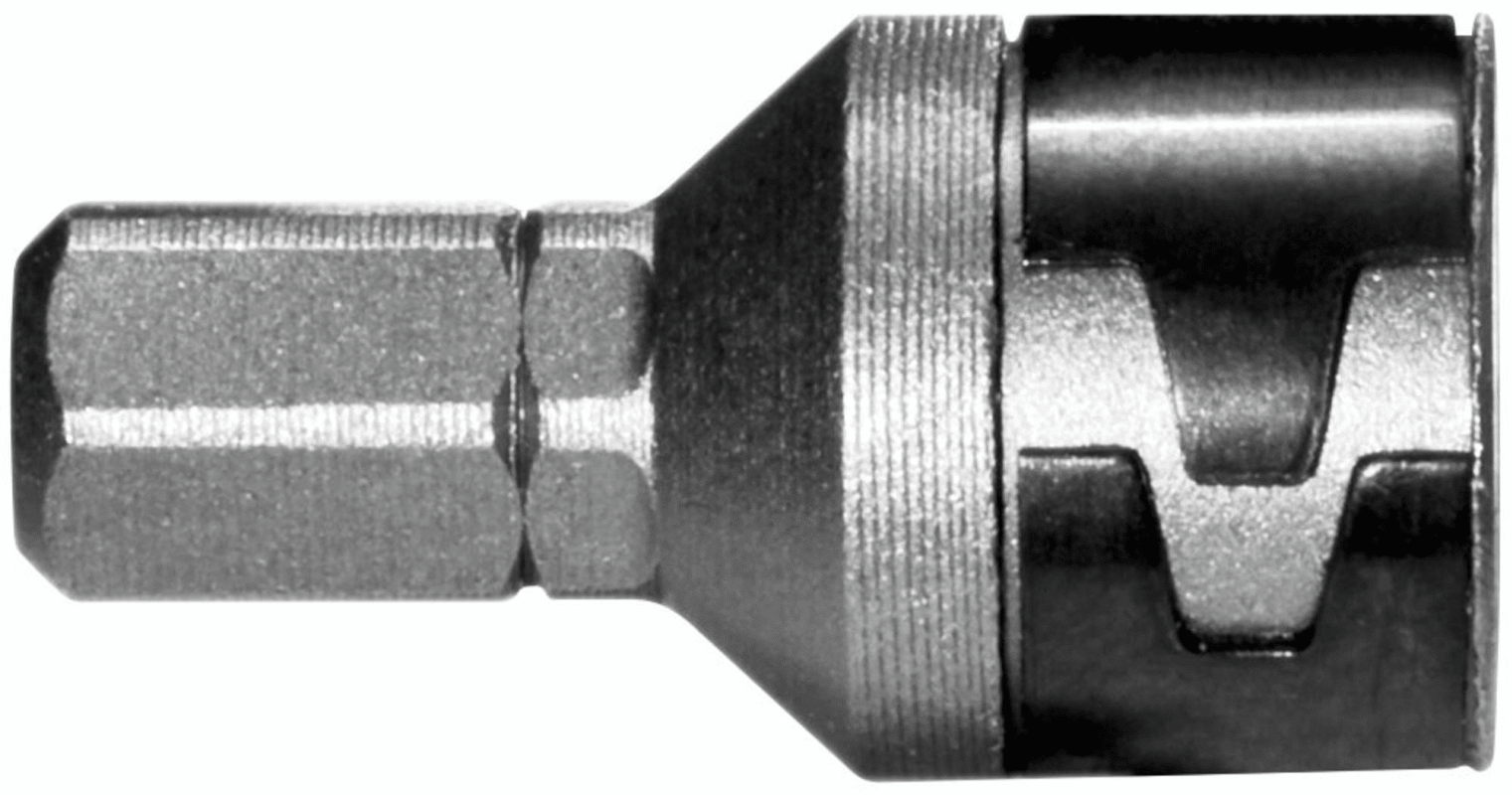 Steckschlüssel für Sechskantkopfschrauben. Der Steckschlüssel ermöglicht die Verarbeitung von Schrauben mit Sechskantkopf in Verbindung mit dem Tiefenanschlags DC UNI FF. Der 1/4" Sechskantschaft wird dazu in die Bitaufnahme gesteckt. Die Kugelklemmung im Steckschlüsselkopf bewirkt eine verbesserte Haltekraft der Schraube auf dem Steckschlüssel.