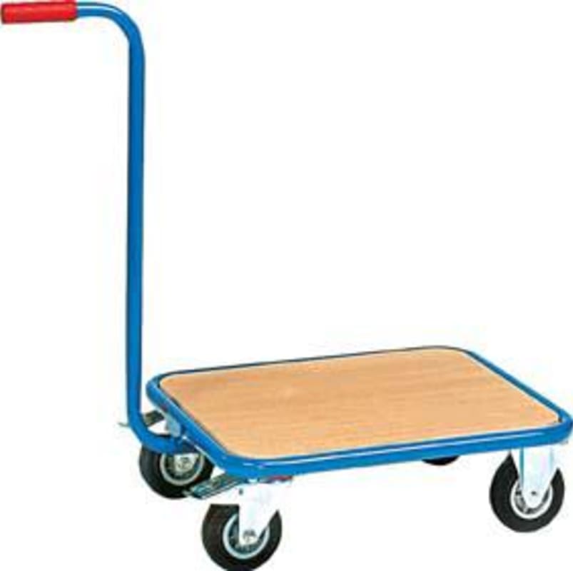 Stahlrohr-Griffroller mit 2 Lenkrollen• Stahlrohr-Konstruktion: geschweißt, pulverbeschichtet • Plattform: Holzplattform • Ladehöhe: 195 mm • Griff: anschraubbar • Rollen: 2 Bockrollen, 2 Lenkroll