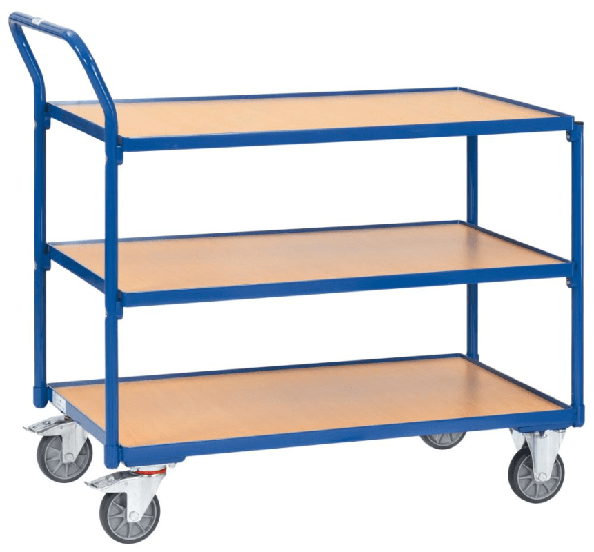 Leichter Tischwagen, 3 Ladeflächen, Schiebegriff hochstehend• Stahlrohr-/Profilstahl-Konstruktion: geschweißt, pulverbeschichtet • Schraubkonstruktion • Plattformen: Holzwerkstoff-Platten, im Stahlr