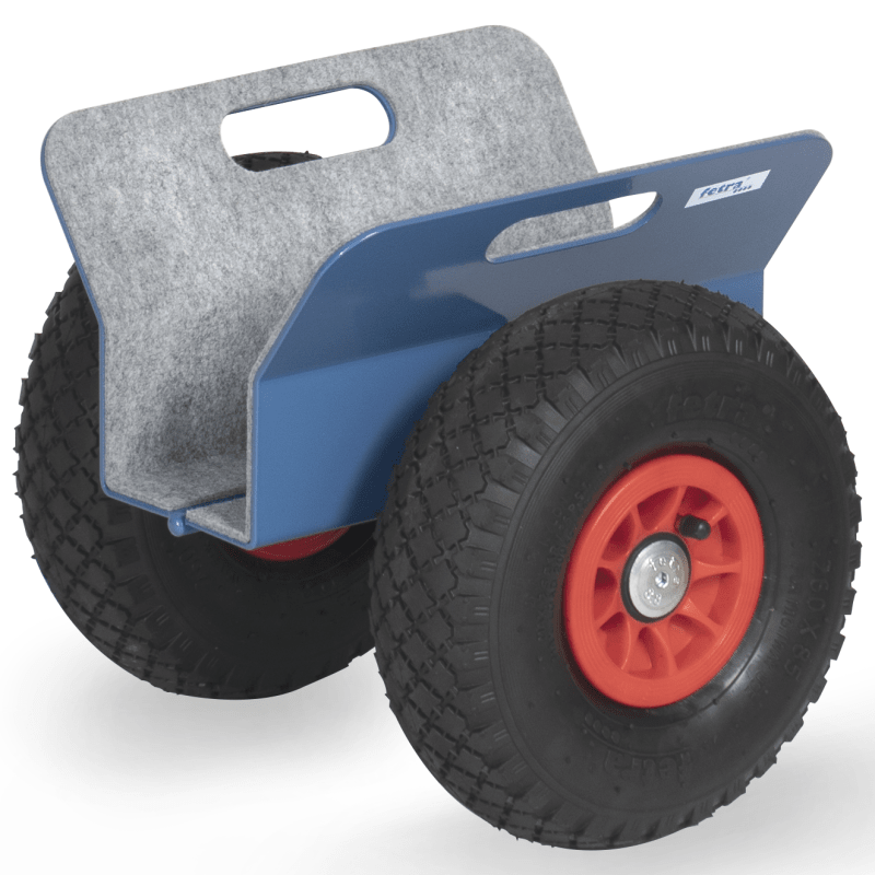 PlattenrollerStahl-Schweißkonstruktion, pulverbeschichtet blau RAL 5007, Klemmflächen mit Filzbelag. Sichere Klemmung durch das Gewicht des Ladegutes auf die Klappkonstruktion. Reifen mit Luftbereifun