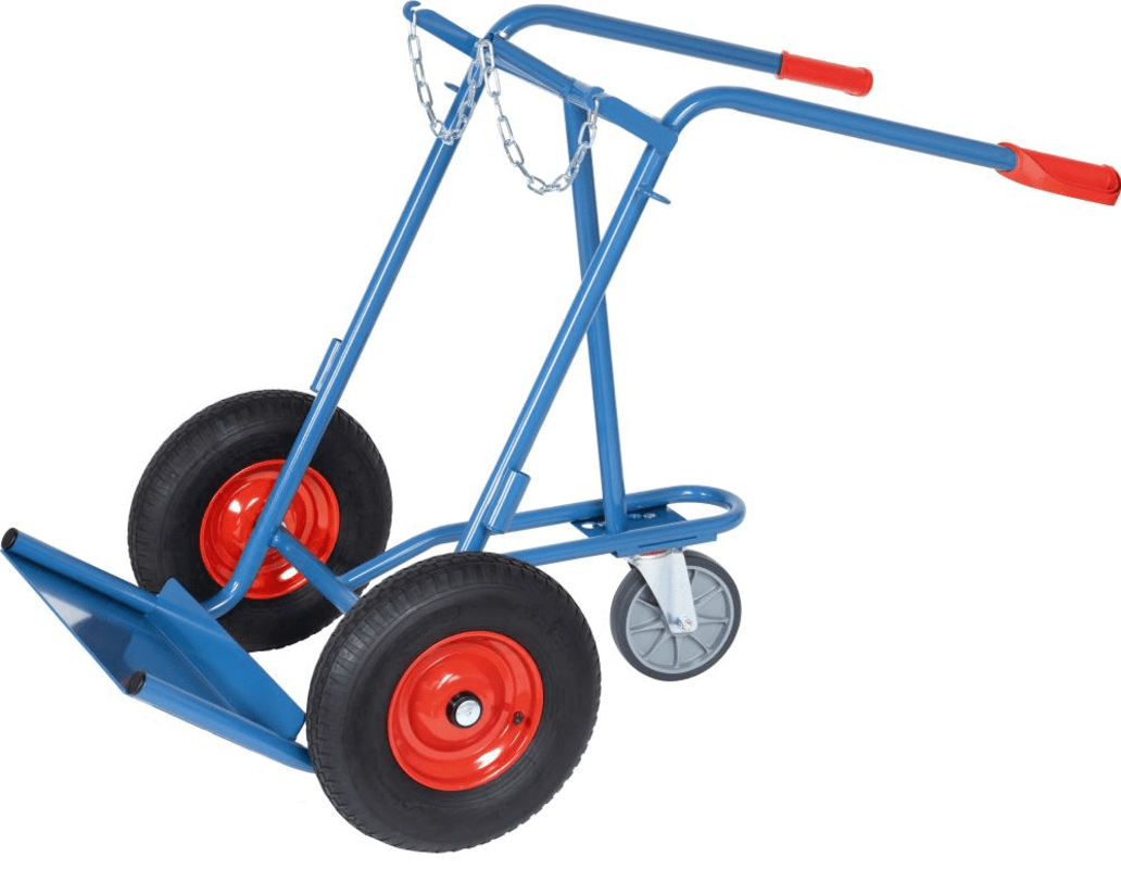 Stahlflaschen-Karre für 2 Flaschen, mit Schweißdrahtköcher und Stützrolle• Stahlrohr-Konstruktion: sauber verschweißt, pulverbeschichtet in RAL 5007 brillantblau • Flaschen-Halterung: mit einhängbare
