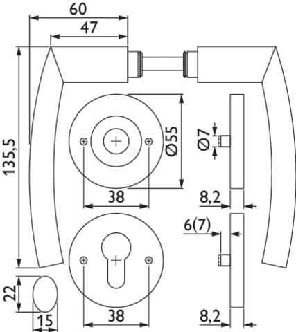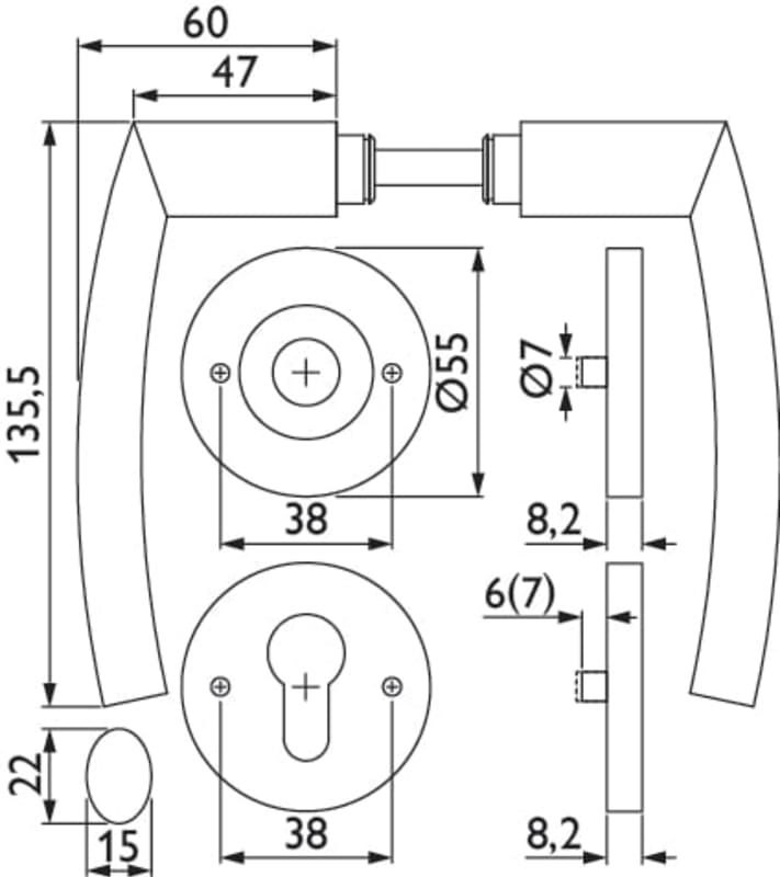 Feuerschutz-Drückergarnitur 1807 BASIC 07, mit Gleitlager-Rosetten 2073 FS, Ausf.: PZ, GK 4/7, fest/drehbar, 9 mm Vierkant, Türstärke 40 - 58 mm, Oberfl. 60 (Edelstahl matt)