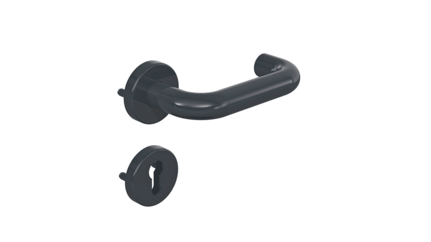 HEWI Drückergarnitur 111R12.230; Produkttyp: Drückergarnitur; Produkttyp (Hersteller): Drückergarnitur; Ausführung: Rosette; Befestigungsart Drückerrosette (außen): verdeckt verschraubt; Befestigungsart Drückerrosette (innen): verdeckt verschraubt; Befestigungstechnik: mit Stütznocken; Montageart: aufliegend; Form Drückerrosette: rund; Form Schlüsselrosette (außen): rund; Form Schlüsselrosette (innen): rund; Vierkant: 9 mm; Material: Kunststoff; Material Türdrücker: Kunststoff; Material Rosetteneinleger: Kunststoff; Material Unterkonstruktion (Griffrosette): Kunststoff-Edelstahlverbundbau; Form Türgriff (innen): U-Form; Ausführung Türgriff (innen): mit Stahlkern; Form Türgriff (außen): U-Form; Ausführung Türgriff (außen): mit Stahlkern; Durchmesser Türgriff (innen): 23 mm; Durchmesser Türgriff (außen): 23 mm; Durchmesser Schlüsselrosette: 55 mm; Länge Türgriff (innen): 150 mm; Länge Türgriff (außen): 150 mm; Höhe Türgriff (innen): 67 mm; Höhe Türgriff (außen): 67 mm; Durchmesser Drückerrosette (außen): 55 mm; Durchmesser Drückerrosette (innen): 55 mm; Höhe Drückerrosette (außen): 10,5 mm; Höhe Drückerrosette (innen): 10,5 mm; Höhe Schlüsselrosette (außen): 10,5 mm; Höhe Schlüsselrosette (innen): 10,5 mm; Lagerung: festdrehbar,wartungsfreies Gleitlager; Einsatzbereich: Objekttür; Türart: Vollblatt; Türwerkstoff: Stahl,Holz; Lochung: Profilzylinder gelocht; DIN-Richtung: DIN Links-Rechts; Material Rosette: Kunststoff; Farbe: grau; Farbton: anthrazitgrau; Oberfläche: hochglanz; Oberfläche Türdrücker: beschichtet; Oberfläche Rosette: beschichtet; Oberfläche Rosetteneinleger: beschichtet; Material Unterkonstruktion (Schlüsselrosette): Kunststoff-Edelstahlverbundbau; Technik: R-Technik; Ausführung Vierkant: geteilter Vierkantstift; Türstärke min.: 58,1 mm; Türstärke max.: 68 mm; Maß XA min.: 19,1 mm; Maß XA max.: 29 mm; Maß XI min.: 19,1 mm; Maß XI max.: 29 mm; Norm: DIN 18273,DIN EN 179,DIN 18040,DIN 18255,DIN EN 1906; Zulassung: für Feuerschutz,für Rauchschutz,für Fluchttüren