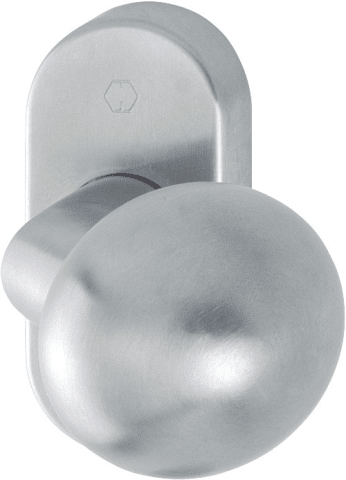 Edelstahl-Feuerschutz-Profiltür-Rosetten-Garnitur: geprüft nach DIN 18273, verkröpfter Knopf feststehend mit HOPPE-FDW-Profilvollstift-Verbindung und Klemmfeder zum Toleranzausgleich in der Schlossnus