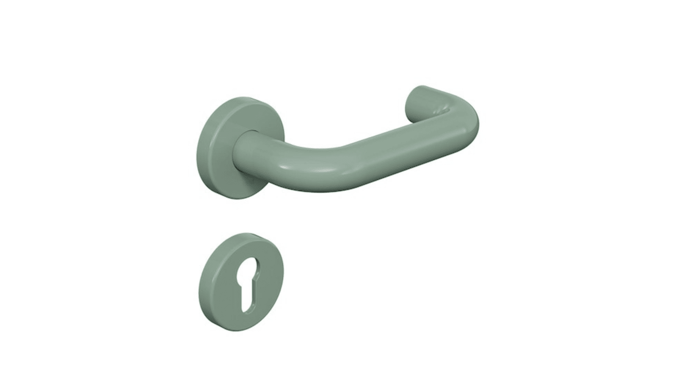 HEWI, Objekttür-Drückergarnitur, Abdeckung: mit Rosetten, Modellnummer: 111R11.230, Lochung: Profilzylinder gelocht, Vierkant: 9mm, Material: Polyamid, Farbton: felsgrau, Oberfläche: hochglanz, DIN-Richtung: DIN Links-Rechts, Lagerung: Festdrehbare Ausgleichslagerung, wartungsfreies Doppellager, Ausführung: mit Stahlkern, Befestigungstechnik: mit Stütznocken, Befestigungsart: verdeckt verschraubt, Befestigungssystem: Stiftverbindung, Material Unterkonstruktion: Kunststoff-Edelstahlverbundbau, Ergänzung: R-Technik, Drücker Ø23mm, Durchmesser: 55mm, Anschlagrichtung: Drücker rechts/links verwendbar, Drückerbefestigung: durch Einrasten in die Unterteile, Drückerform: U-Form, Drückerdurchmesser: 23mm, Drückerlänge: 150mm, Drückerhöhe: 67mm, Form: rund, Stärke Abdeckung: 10,5mm, Türstärke min.: 48,1mm, Türstärke max.: 58mm, Türart: Innentüren, Fluchttüren, Türwerkstoff: Holz, Stahl, Benutzerklasse: Klasse 4, Norm: DIN 18273, DIN EN 179, DIN 18040, DIN 18255 Ausgabedatum: 2002-05, DIN EN 1906, Zulassung: für Feuerschutz, für Notausgänge, Zusatzinformation: Rosetten-Abdeck-Kappe mit 1,5 mm Wandstärke