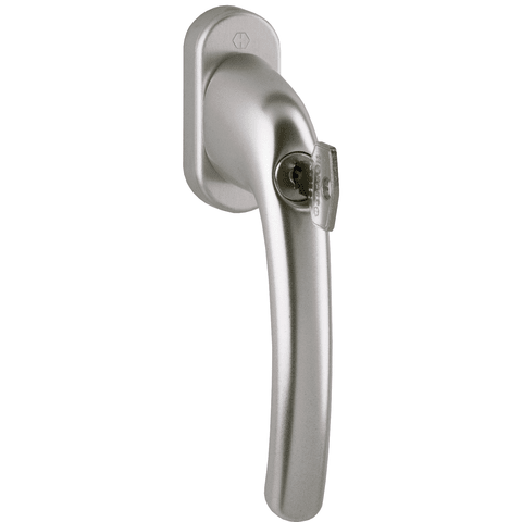 Aluminium-Fenstergriff, abschließbar Secu100®: Erfüllt die Anforderungen nach DIN V ENV 1627-1630 (WK1-6), federnd gelagerte, drehbare Abdeckkappe, Kunststoff-Rosette mit Stütznocken, 7 mm Vollstift, Seitenrastung mit positionsgenauer Raststellung, Druckzylinder mit Wendeschlüssel.