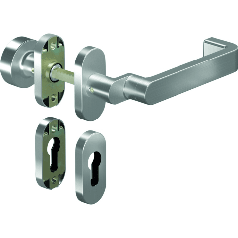 OGRO Wechselgarnitur 8991A/6610SR FS; Produkttyp: Wechselgarnitur; Produkttyp (Hersteller): Wechselgarnitur; Ausführung: Rosette; Befestigungsart Drückerrosette (außen): verdeckt verschraubt; Befestigungsart Drückerrosette (innen): verdeckt verschraubt; Befestigungsart Schlüsselrosette (außen): verdeckt verschraubt; Befestigungsart Schlüsselrosette (innen): verdeckt verschraubt; Befestigungstechnik: ohne Stütznocken; Montageart: aufliegend; Form Drückerrosette: eckig; Form Schlüsselrosette (außen): eckig; Form Schlüsselrosette (innen): eckig; Vierkant: 9 mm; Material: Edelstahl; Form Türgriff (innen): versetzt,Design; Form Türgriff (außen): rund; Ausführung Türgriff (außen): fest; Länge Türgriff (innen): 156 mm; Höhe Türgriff (innen): 60 mm; Höhe Türgriff (außen): 41 mm; Breite Drückerrosette (außen): 31,5 mm; Breite Drückerrosette (innen): 31,5 mm; Länge Drückerrosette (außen): 68,5 mm; Länge Drückerrosette (innen): 68,5 mm; Höhe Drückerrosette (außen): 9 mm; Höhe Drückerrosette (innen): 9 mm; Breite Schlüsselrosette (außen): 31,5 mm; Breite Schlüsselrosette (innen): 31,5 mm; Länge Schlüsselrosette (außen): 68,5 mm; Länge Schlüsselrosette (innen): 68,5 mm; Höhe Schlüsselrosette (außen): 9 mm; Höhe Schlüsselrosette (innen): 9 mm; Lagerung: festdrehbar; Einsatzbereich: Objekttür; Türart: Rohrrahmen; Türwerkstoff: Aluminium,Kunststoff; Anwendung: außen/innen; Lochung: Profilzylinder gelocht; DIN-Richtung: DIN Links-Rechts; Farbe: grau; Farbton: edelstahl; Oberfläche: satino; Technik: Click&Go Technik; Ausführung Vierkant: Wechselstift; Design Türdrücker: by Botti; Türstärke min.: 35 mm; Türstärke max.: 48 mm; Norm: DIN EN 179,DIN 18273,DIN EN 1906; Zulassung: für Rauchschutz,für Fluchttüren,für Feuerschutz