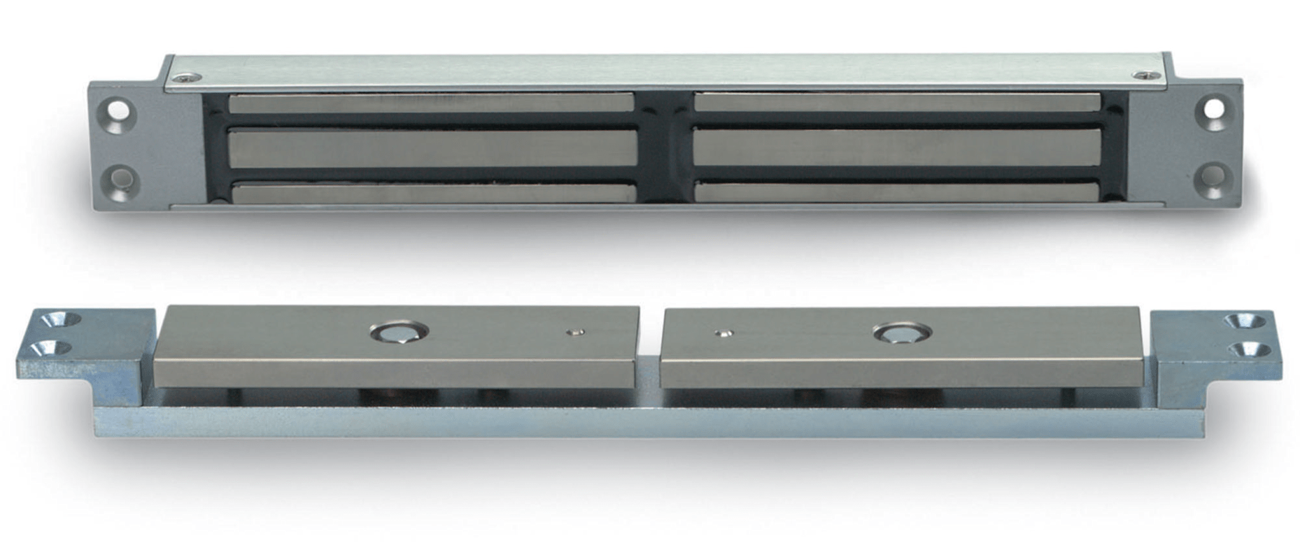 Zur verdeckten Absicherung von Türen in Rettungswegen|Flächenhaftmagnet in kompakter Bauweise. Ohne Überwachungskontakte mit Haftgegenplatte in schmaler Geräteausführung für den Türzargen-Einbau, formstabiles Aluminium-Gehäuse für Einbaumontage.