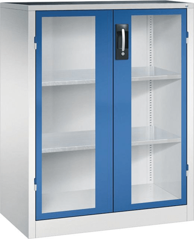 Schwerlast-Beistellschrank, mit Flügeltüren • Material: Stahlblech mit hochwertiger Einbrennbeschichtung • Sichtfenster: 3-mm-Acrylglas, fest verklebt, verdeckte Schließstangen • Türen: Scharniere au