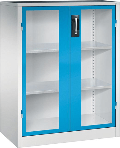 Schwerlast-Beistellschrank, mit Flügeltüren • Material: Stahlblech mit hochwertiger Einbrennbeschichtung • Sichtfenster: 3-mm-Acrylglas, fest verklebt, verdeckte Schließstangen • Türen: Scharniere außen liegend, ca. 180°-Öffnungswinkel • Griffe: Ergo-Lock-Griff • Verschluss: patentiertes, 3-riegeliges Griffschloss Ergo-Lock 4.0 mit 2 Schlüsseln, zum Schließen einfach zudrücken • Innenausstattung: im 15-mm-Raster höhenverstellbar • Schranklast: 700 kg • Fachböden: verzinkt • Fachboden-Traglast: 110 kg • Mit oberer Gummiriefenmatte