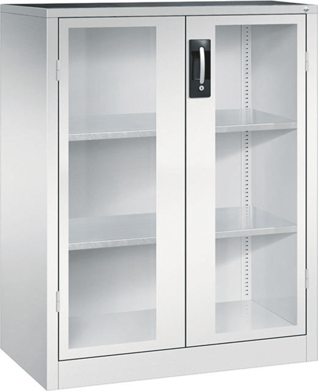Schwerlast-Beistellschrank, mit Flügeltüren • Material: Stahlblech mit hochwertiger Einbrennbeschichtung • Sichtfenster: 3-mm-Acrylglas, fest verklebt, verdeckte Schließstangen • Türen: Scharniere außen liegend, ca. 180°-Öffnungswinkel • Griffe: Ergo-Lock-Griff • Verschluss: patentiertes, 3-riegeliges Griffschloss Ergo-Lock 4.0 mit 2 Schlüsseln, zum Schließen einfach zudrücken • Innenausstattung: im 15-mm-Raster höhenverstellbar • Schranklast: 700 kg • Fachböden: verzinkt • Fachboden-Traglast: 110 kg • Mit oberer Gummiriefenmatte
