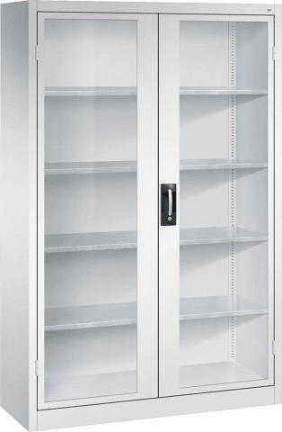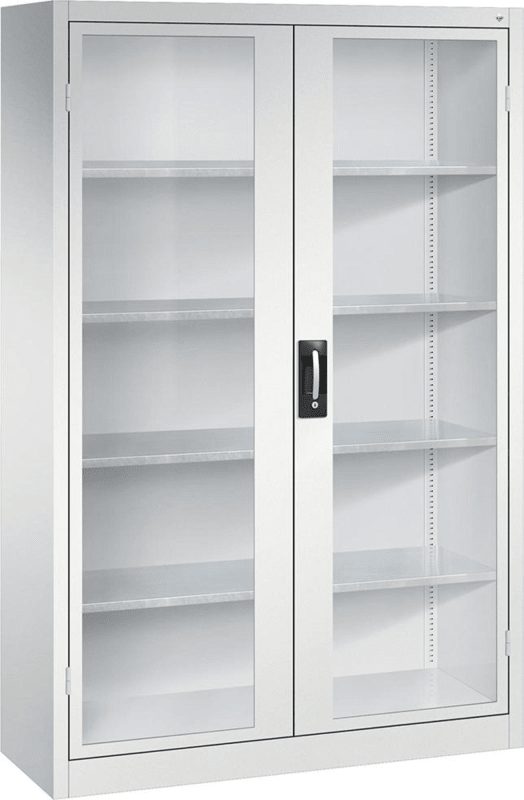 Schwerlastschrank, mit Flügeltüren • Material: Stahlblech mit hochwertiger Einbrennbeschichtung • Sichtfenster: 3-mm-Acrylglas, fest verklebt, verdeckte Schließstangen • Türen: Scharniere außen liege