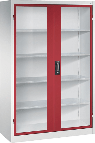Schwerlastschrank, mit Flügeltüren • Material: Stahlblech mit hochwertiger Einbrennbeschichtung • Sichtfenster: 3-mm-Acrylglas, fest verklebt, verdeckte Schließstangen • Türen: Scharniere außen liege