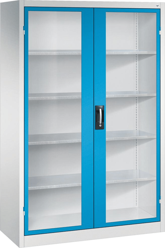 Schwerlastschrank, mit Flügeltüren • Material: Stahlblech mit hochwertiger Einbrennbeschichtung • Sichtfenster: 3-mm-Acrylglas, fest verklebt, verdeckte Schließstangen • Türen: Scharniere außen liege