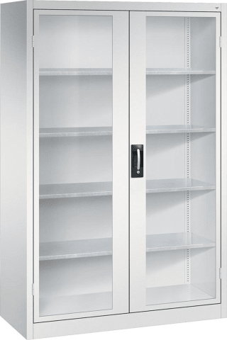Schwerlastschrank, mit Flügeltüren • Material: Stahlblech mit hochwertiger Einbrennbeschichtung • Sichtfenster: 3-mm-Acrylglas, fest verklebt, verdeckte Schließstangen • Türen: Scharniere außen liege