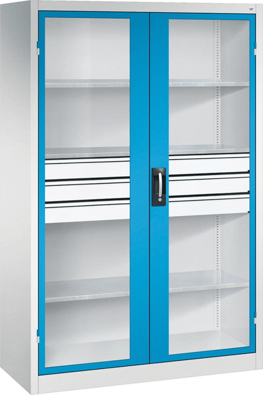 Schwerlastschrank mit Flügeltüren und Schubladenblock mittig • Material: Stahlblech mit hochwertiger Einbrennbeschichtung • Sichtfenster: 3-mm-Acrylglas, fest verklebt, verdeckte Schließstangen • Tür