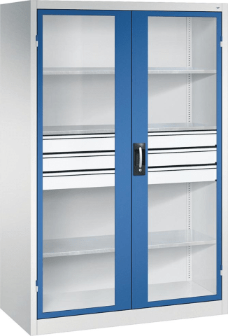 Schwerlastschrank mit Flügeltüren und Schubladenblock mittig • Material: Stahlblech mit hochwertiger Einbrennbeschichtung • Sichtfenster: 3-mm-Acrylglas, fest verklebt, verdeckte Schließstangen • Tür
