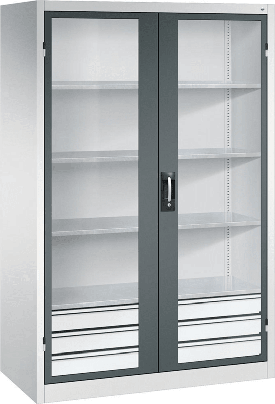 Schwerlastschrank, mit Flügeltüren und Schubladenblock unten • Material: Stahlblech mit hochwertiger Einbrennbeschichtung • Sichtfenster: 3-mm-Acrylglas, fest verklebt, verdeckte Schließstangen • Tür